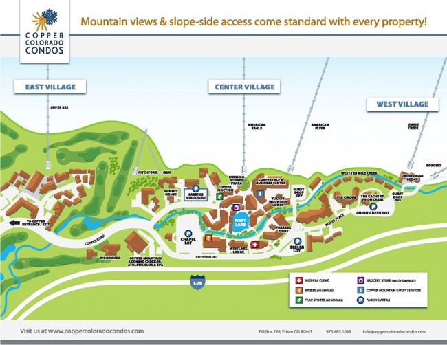Take US-24 West for approximately 65 miles. Turn right onto CO Highway 9 traveling North continuing through Fairplay and Alma over Hoosier Pass. CO Highway 9 becomes Main Street in Breckenridge. Follow Main Street North through the roundabout continuing on Highway 9 to Frisco. Turn left at the light at Frisco Main Street. Continue through Frisco toward I-70, and turn left onto I-70 West. Go 6 miles to the Copper Mountain/Leadville exit #195. Take exit #195 over the bridge and turn right at the first stoplight onto Copper Road.