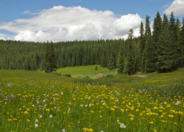 At the start, the road switchbacks a few times, climbing steeply, with great views of Copper Mountain to the east. After about 1 mile, the road levels out, tracing a path next to spectacular red sandstone bluffs to the north and broad, flower-filled valley to the south — one of the best wildflower spots in the area, and if you happen to be in the area during a meteor shower, this part of the road offers some of the best 260-degree views of the night sky. In the late summer, and especially autumn, you may see large herds of elk congregating on the sparsely forested hillsides to the south.
